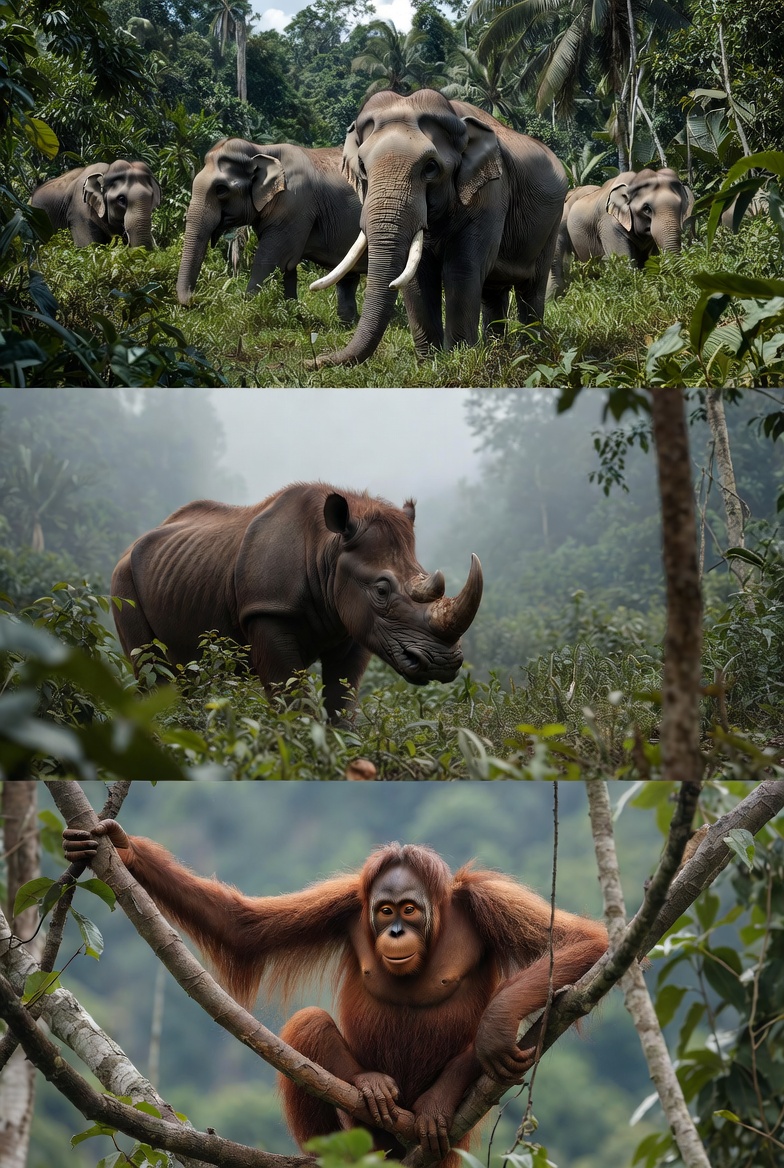 - Orangutan Kalimantan (Pongo pygmaeus) — Habitat menyusut akibat deforestasi dan perkebunan sawit.